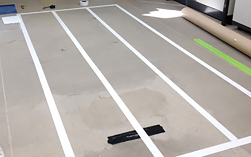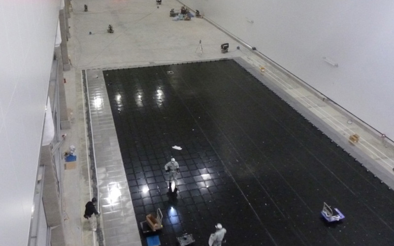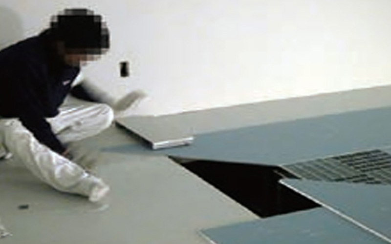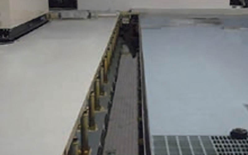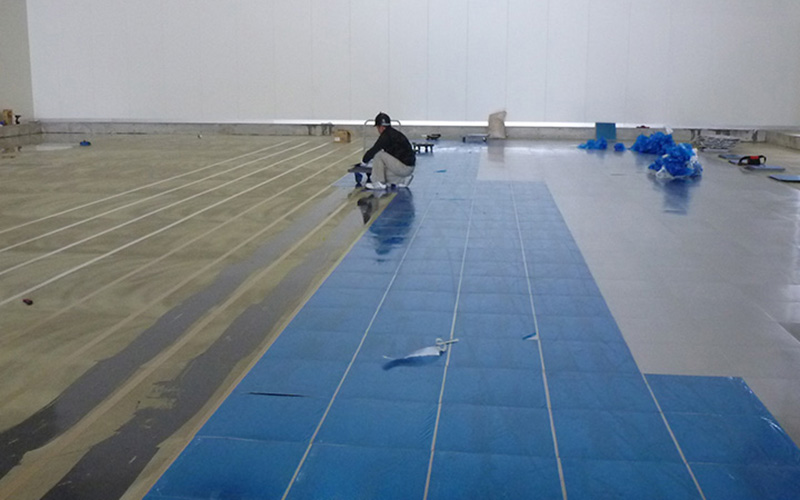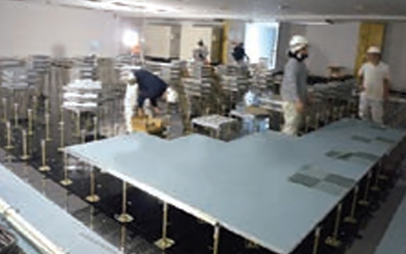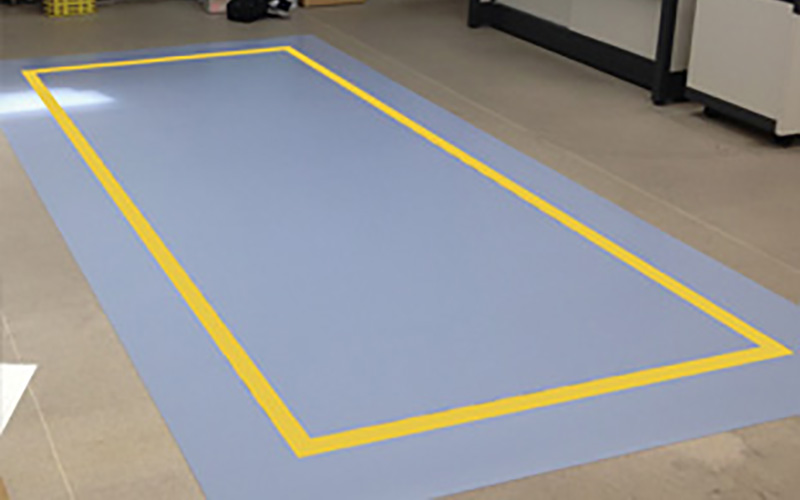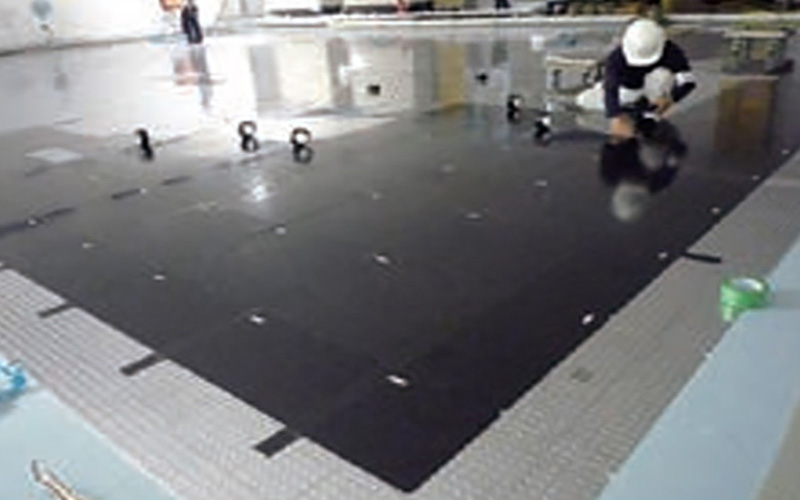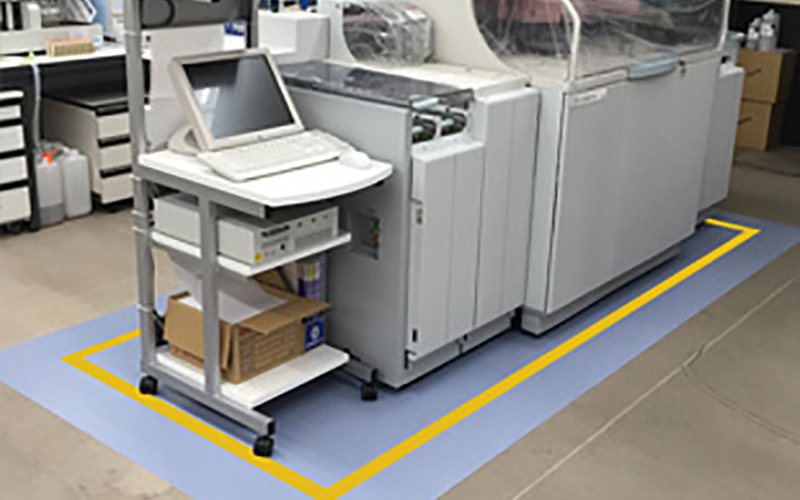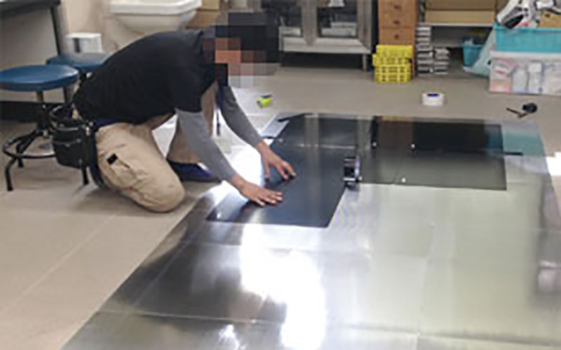 As easy as installing carpet tiles, a base-isolated floor can be constructed in a short period of time. μ-Solator is extremely thin, with a total thickness of only 3–5 mm, including the main body and protective sheet, enabling smooth operation of equipment and carts.