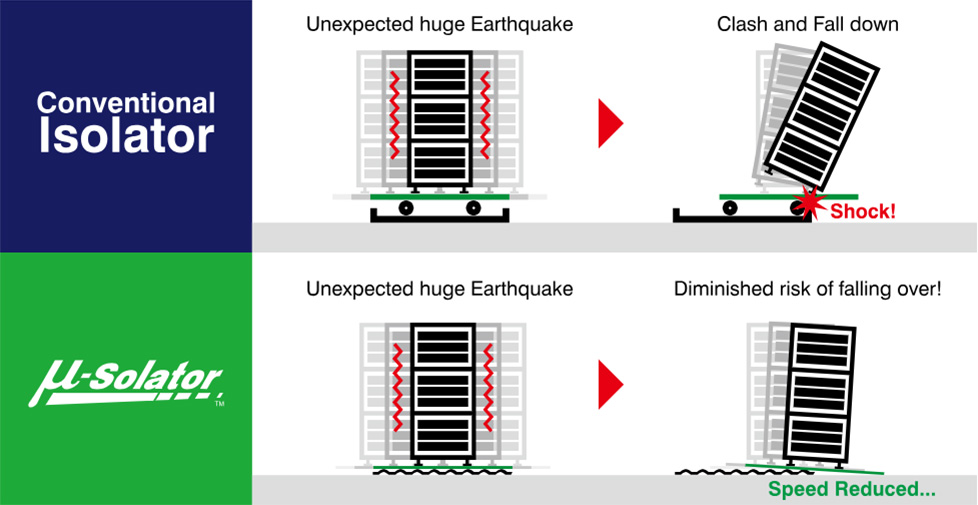 In conventional seismic isolation devices, seismic motions exceeding the allowable displacement range can generate excessive impact forces, potentially resulting in overturning. μ-Solator is designed with a fail-safe system to maintain structural stability and ensure the highest possible level of safety even in the event of an "unanticipated" earthquake, thereby minimizing overturning risk.